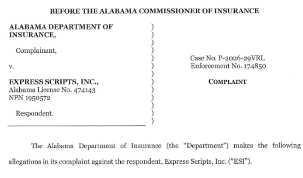 In early 2026, Alabama's PBM Compliance Division, under the supervision of the Department of Insurance, issued a finding against Express Scripts. This was the first enforcement action of its kind in the United States.